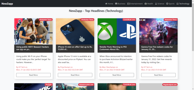 NewsZapp is a website which can be used for the purpose of reading latest day to day news accross various categories such as business, politics, sports, health, entertainment and many more! Just click on the category of your choice and news for the same will be populated on the feed.